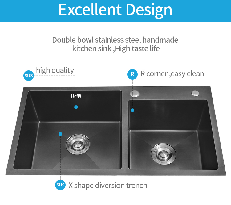 Fregadero hecho a mano de gran oferta con buena calidad, tamaño 780 * 430 mm, diseño de doble ranura, hecho de acero inoxidable de alta calidad, la profundidad y el grosor se pueden personalizar según su pedido, nano negro y rosa dorado, también con acabado mate para su elección, es un multifuncional fregadero, se puede usar en laboratorio, hotel, apartamento, hospital, granja, etc. Su logotipo se puede grabar o grabar con láser y el paquete se puede diseñar con su autorización